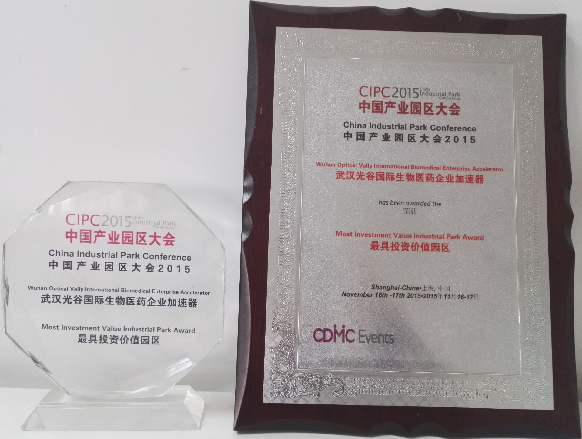 2015中國產業(yè)園區(qū)大會“最具投資價值園區(qū)”獎(光谷生物醫(yī)藥加速器)