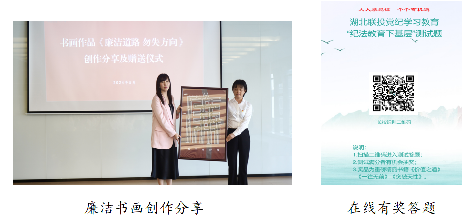 ?講解《中國共產(chǎn)黨紀(jì)律處分條例》2023年修訂版的核心精神,結(jié)合典型案例深入淺出解讀重點條款,“一堂課”緊扣黨紀(jì)學(xué)習(xí)教育主旋律;幸福、法治、權(quán)力、牢獄、學(xué)識,人生道路千萬條,不一樣的選擇、不一樣的歸宿,“一幅畫”《廉潔道路,勿失方向》昭示廉與正的方向;雄關(guān)漫道真如鐵,而今邁步從頭越,“一首詩”《憶秦娥·婁山關(guān)》重溫偉大建黨精神;“遵守紀(jì)律人人要自覺,互相監(jiān)督切莫違犯了”,“一首歌”《三大紀(jì)律八項注意》唱響聯(lián)投人始終將紀(jì)律和規(guī)矩挺在前面的堅守;“碧海藍(lán)天,凈由廉欣”“去污沉淀水質(zhì)優(yōu),廉潔洗滌心靈美”,“一句話”寄寓本色初心;“黨的六大紀(jì)律有哪些,新修訂的《中國共產(chǎn)黨紀(jì)律處分條例》自何時起施行?”,“一張卷”考問紀(jì)法常識?!傲鶄€一”的宣教活動讓現(xiàn)場黨員干部員工“止饑解渴”、學(xué)有所獲。